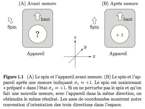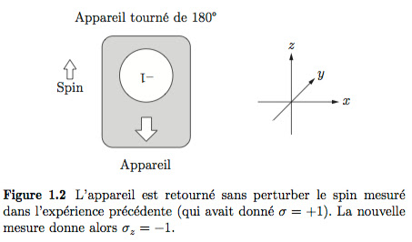 Ensuite, nous remettons l’appareil à zéro et, en prenant soin de ne pas perturber le spin, mesurons à nouveau σ. Dans l’hypothèse de la loi élémentaire donnée par l’équation (1.1), nous devons obtenir la même réponse que dans la mesure précédente. De fait, le résultat σ = +1 sera suivi par σ = +1. De même σ = −1 sera suivi par σ = −1. La même chose sera vraie quel que soit le nombre de répétitions de l’expérience. C’est une bonne chose car cela nous permet de confirmer le résultat de l’expérience.
