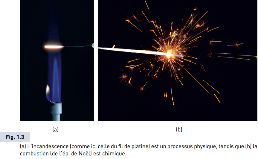Comme autre exemple, on peut citer l’incandescence et la combustion. Si on place un fil de platine dans la flamme chaude du bec bunsen, on observe qu’il devient incandescent. Une fois sorti de la flamme, il reprend son aspect initial. Le phénomène est donc physique. Si on place un épi de Noël fait d’une « pâte » d’aluminium dans la flamme, l’épi devient lumineux mais il se consume par réaction de combustion de l’aluminium. La matière est transformée, le phénomène est donc chimique (fig. 1.3)