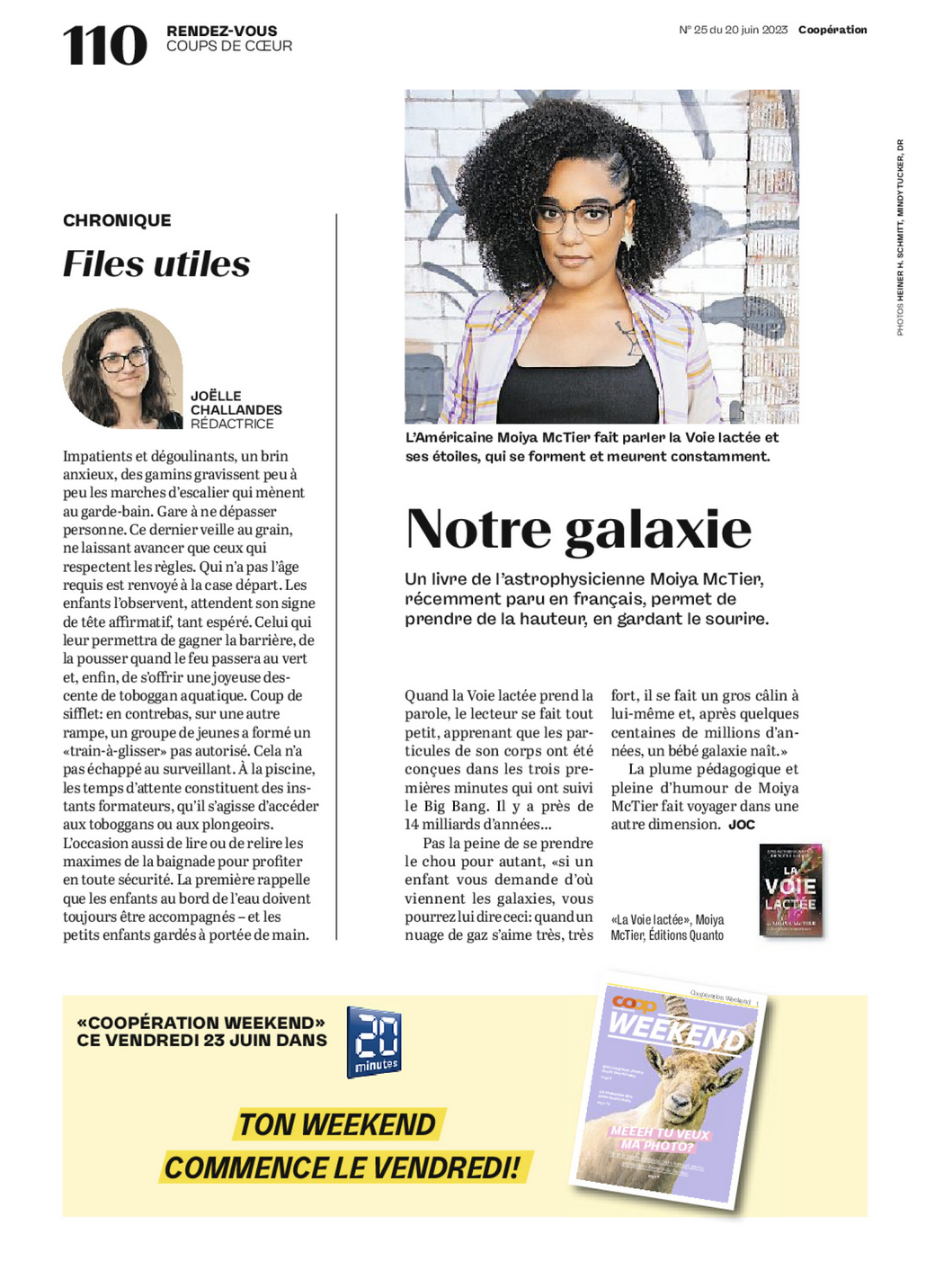 Née il y a environ 14 milliards d’années, soit moins d’un milliard d’années après l’Univers lui-même, la Voie lactée a passé des millénaires à absorber les étoiles et les galaxies naines les plus proches, à voir d’autres galaxies s’éloigner, à se faire des «amies» (dont Andromède, «la plus grande, la plus brillante et la plus importante» de ses voisines). Avec une sagesse distante, une pointe d’arrogance et surtout une vulnérabilité surprenante et beaucoup d’humour, la galaxie nous raconte l’histoire et l’avenir de l’Univers de façon limpide.