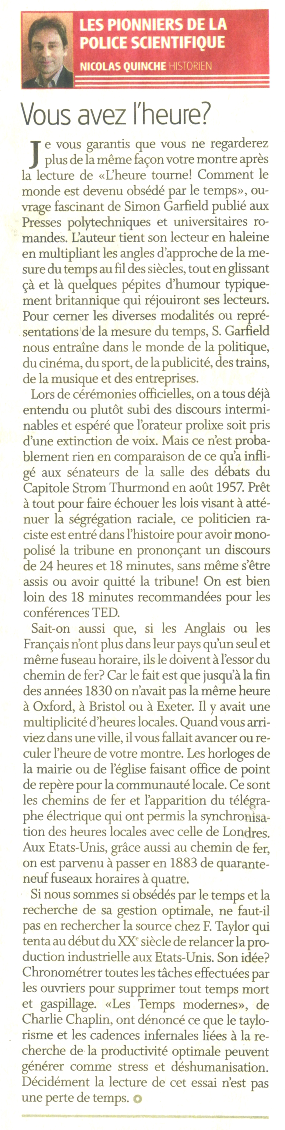 Serions-nous devenus fous? Alors que le temps s’est paisiblement écoulé durant des siècles, il s’est peu à peu insinué dans nos vies au point d’en déterminer les moindres aspects. Simon Garfield le montre à travers mille histoires véridiques aussi drôles que surprenantes. On apprend ainsi pourquoi certains hommes dépensent des millions pour une montre, pourquoi les chansons des Beatles durent 2 minutes 30, en quoi la 9e de Beethoven est à l’origine du CD, pourquoi les montres indiquent toutes 10 h 10 dans les vitrines des horlogers et pourquoi il est risqué de voyager un 30 juin. Dans l’intervalle des horaires de train en déroute, on croisera des horloges ne comportant que 10 heures, des calendriers révolutionnaires et un prince Charles s’efforçant d’arrêter le temps. L’heure tourne! nous explique notre rapport au temps et notre insatiable besoin de le mesurer, de le contrôler, de le filmer et de l’immortaliser dans un monde en constante accélération.