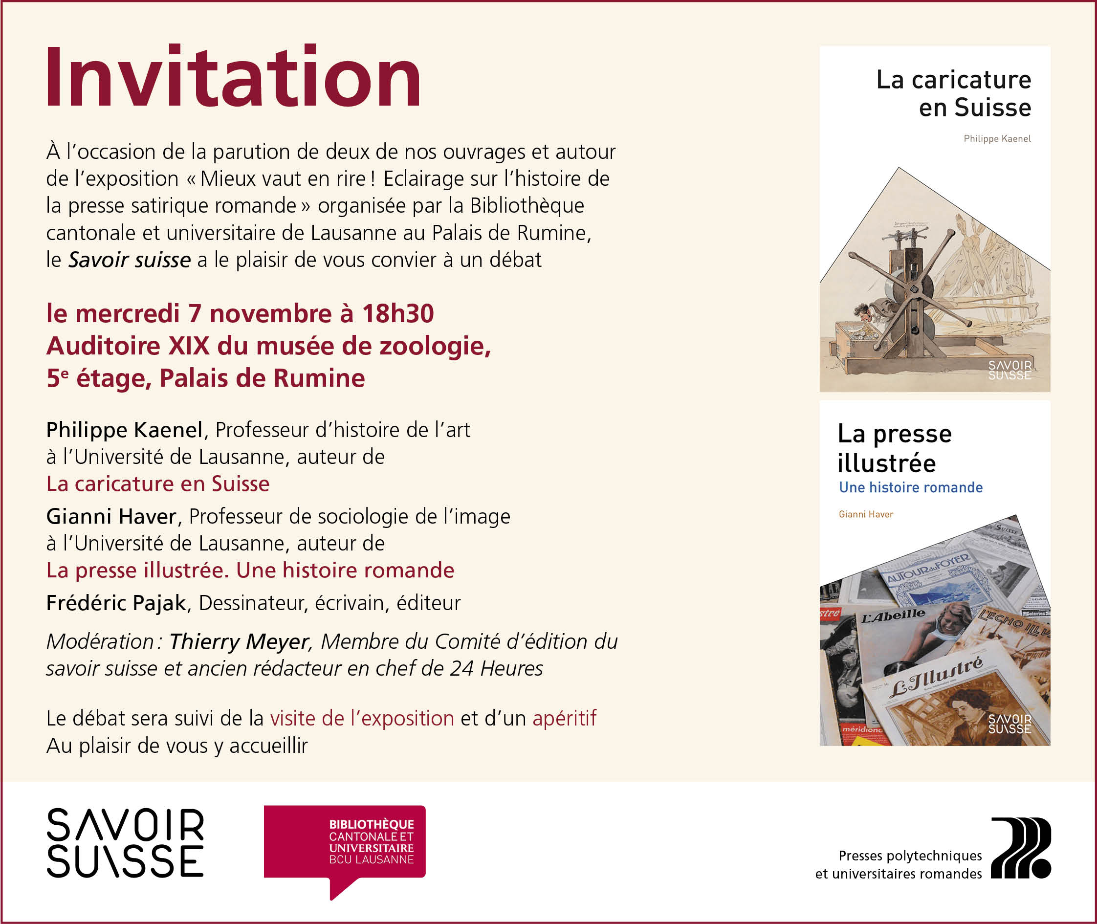 Débat entre Philippe Kaenel (La caricature en Suisse), Gianni Haver (La presse illustrée, une histoire romande) et Frédéric Pajak, dessinateur, écrivain, éditeur Le débat sera modéré par Thierry Meyer, Membre du comité d'édition du savoir suisse et ancien rédacteur en chef de 24Heures