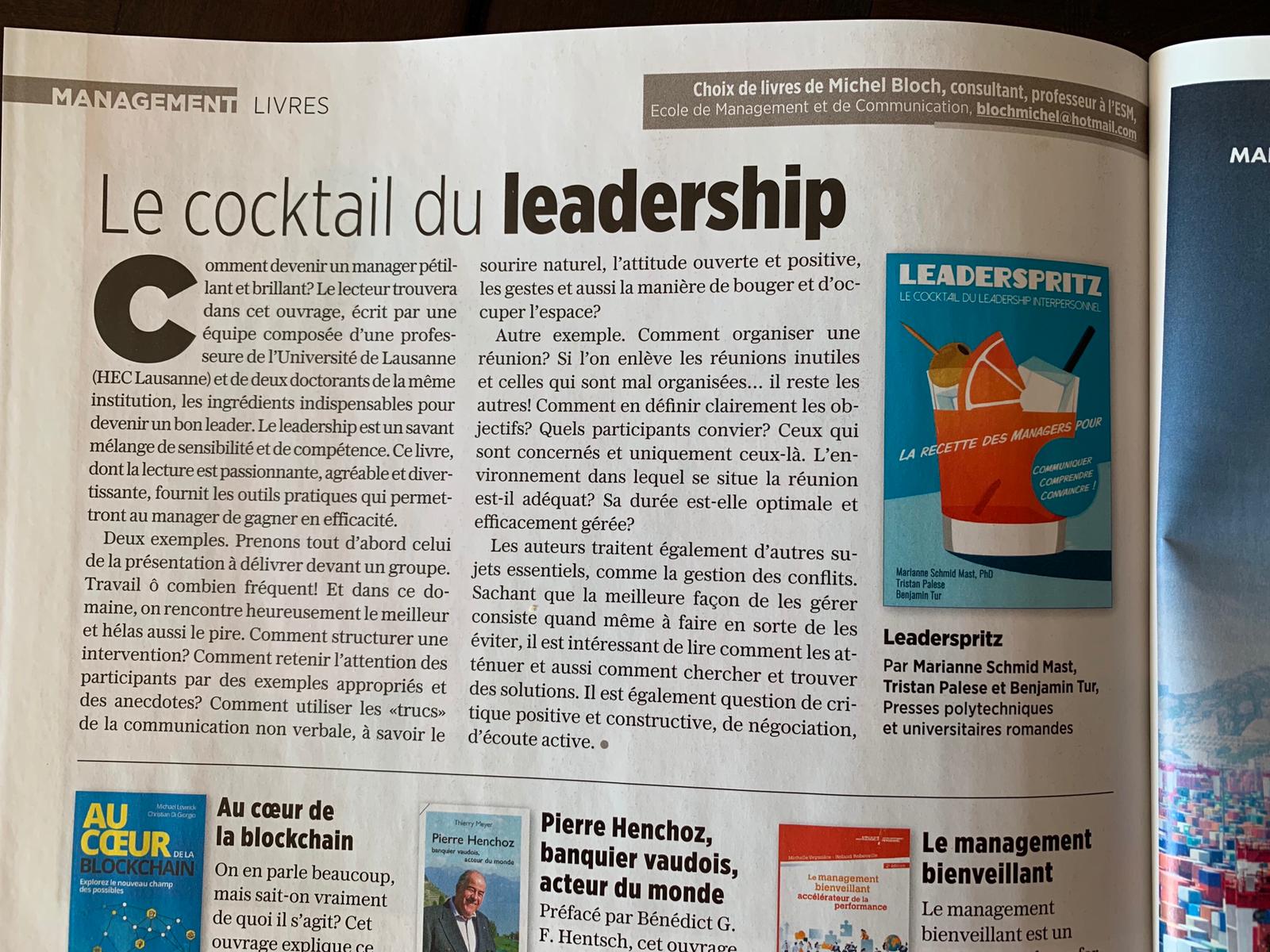 Etre en position dominante et ne pas savoir comment bien utiliser ce pouvoir. Occuper la place de leader, mais se trouver pris au dépourvu face aux demandes des membres de son équipe. Ces situations répandues sont stressantes pour de nombreux cadres ou responsables. A l’heure où les hiérarchies sont remises en cause et où les nouveaux modèles de management pullulent, existe-t-il des recettes pour améliorer ses aptitudes en matière de communication interpersonnelle et pour apparaître comme une source d’inspiration et un guide aux yeux de ses collaborateurs? La professeure Marianne Schmid Mast, Tristan Palese et Benjamin Tur, tous trois travaillant à la Faculté des HEC de l'Université de Lausanne, répondent par l’affirmative dans un livre au titre qui donne soif: Leaderspritz.